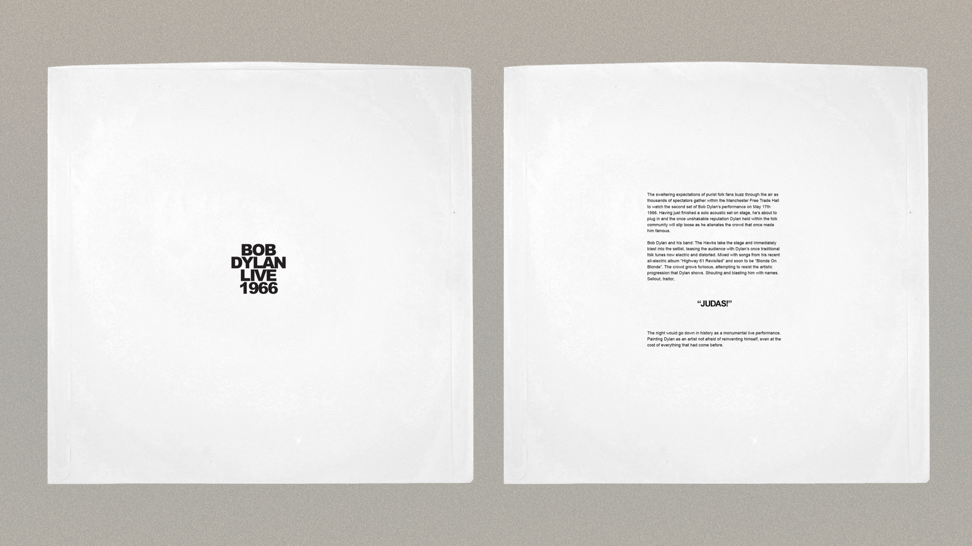 Bob Dylan Live 1966 is a project taking the Iconic “Manchester Free Trade Hall” concert and reimagining it for a commercial release in stores. Often reserved for special editions, the recording documents the moment Dylan was called “Judas” and the wild electric sound of his then backup band: The Hawks. The design includes LP jacket, Labels, and Inner sleeve. The jacket was designed to be stylistically in line with his other records released within the 60s. Following design trends of that era.